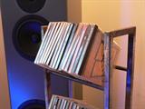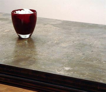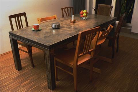 Das Gestell besteht aus einem soliden Stahlrahmen, auf den die ca. 4 cm dicke Tischplatte mit einem Spalt von ca. 5 mm aufgelegt wird. Dadurch wirkt die Platte schwebend.